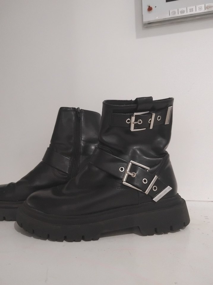 Siyah deri, tokalı ve blok topuklu goth botlar. Günlük kullanıma uygun, grunge punk tarzını yansıtır.