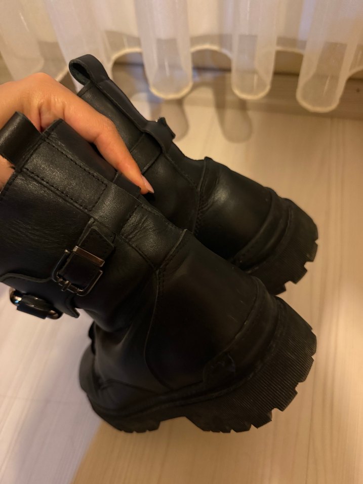 Siyah deri, tokalı ve ince topuklu goth tarzı kadın botları, grunge punk esintili, günlük kullanıma uygun.