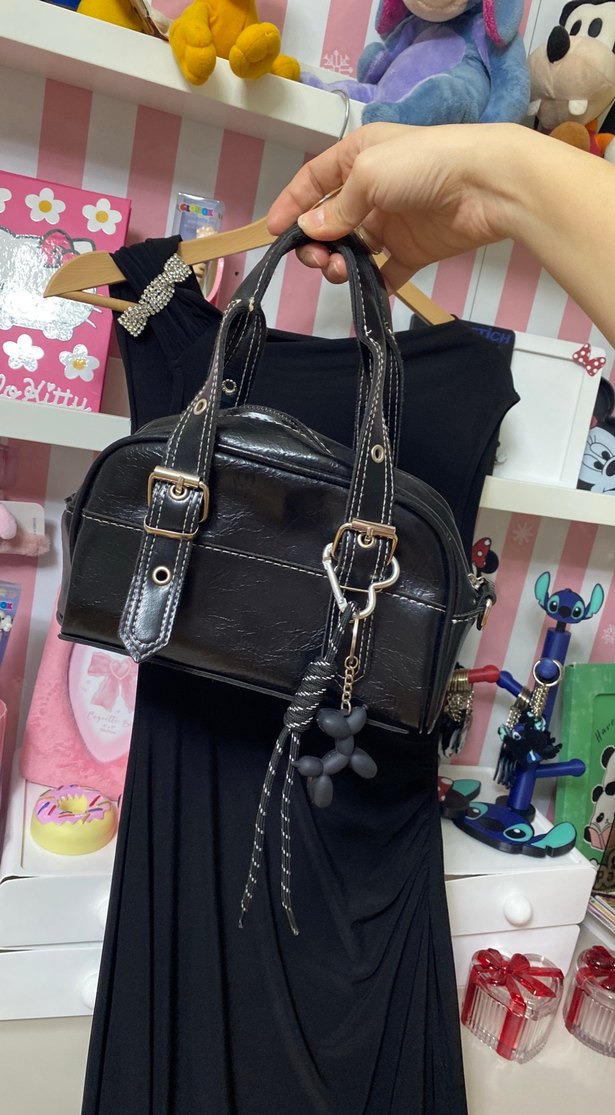 Tokalı kayışları ve baskılı deseni olan siyah deri çanta, eğlenceli bir aksesuarla tamamlanmıştır. Günlük kullanıma uygun, trend şık tarzda.