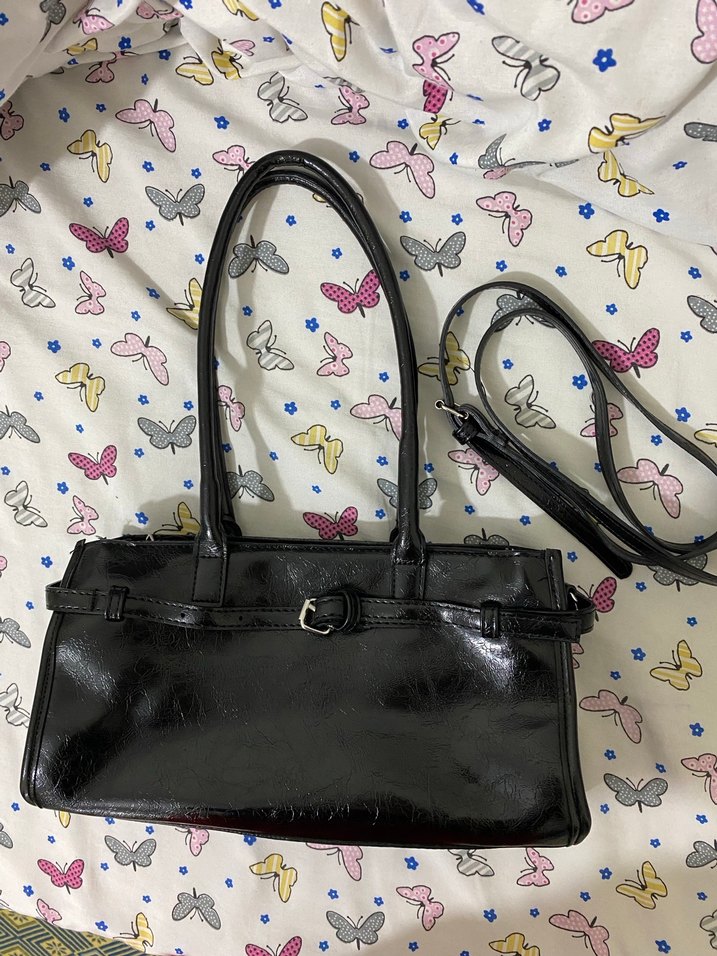 Siyah deri, tokalı, desensiz yüzeye sahip gotik tarzda kadın çantası, günlük kullanıma uygundur. Çok az kullandım göründüğü gibi katlanma izi içini doldurunca olmuyor şuan boş