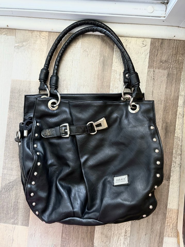 Siyah deri tokalı ve metal çıtçıt detaylı bu gotik tarz kadın çantası, trend günlük kullanım için uygundur.
