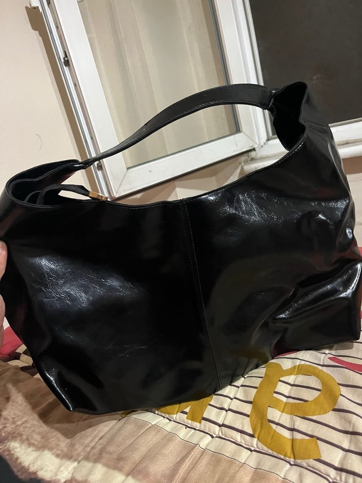 Siyah deri tokalı, gotik tarzda kadın çanta. Günlük kullanım için uygun, desen içermeyen şık tasarım.