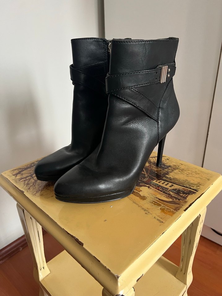 Siyah deri kadın botları, ince topuklu ve tokalı detaylı, ofis için klasik gotik şıklık sunar.