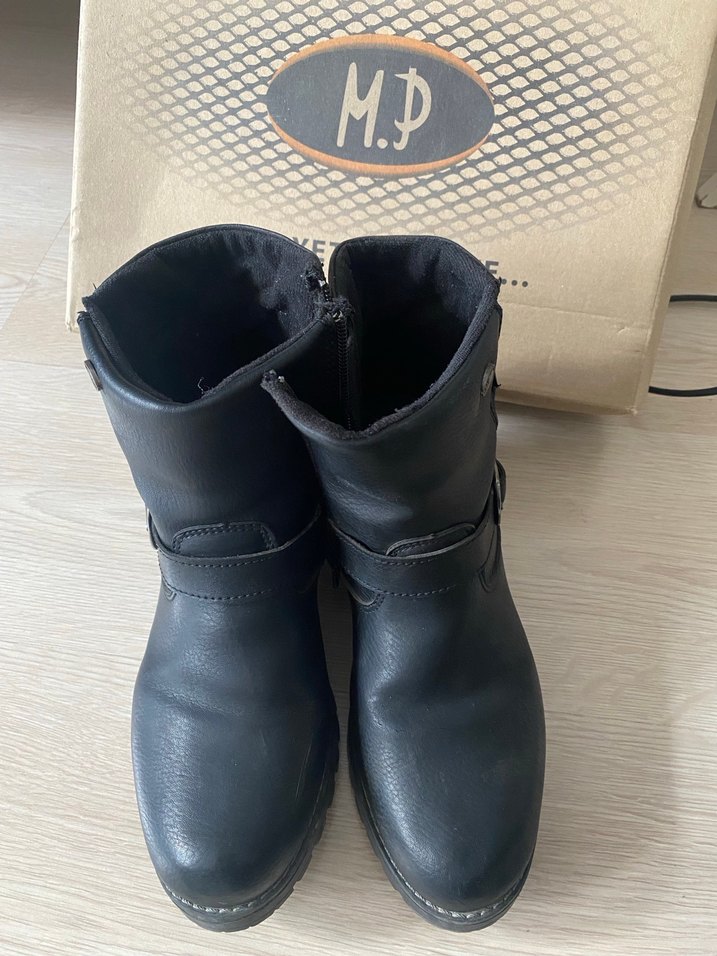 Siyah deri, tokalı kadın biker botu. Dolgu topuklu, rahat ve gündelik kullanıma uygun. M.0 işaretli.