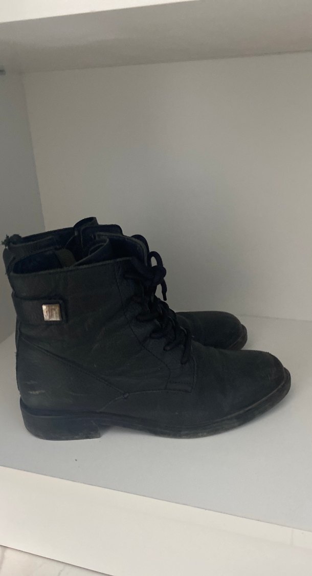 Siyah deri, tokalı ve blok topuklu kadın botu. Goth tarzında, günlük kullanıma uygun, trend bir görünüme sahip.