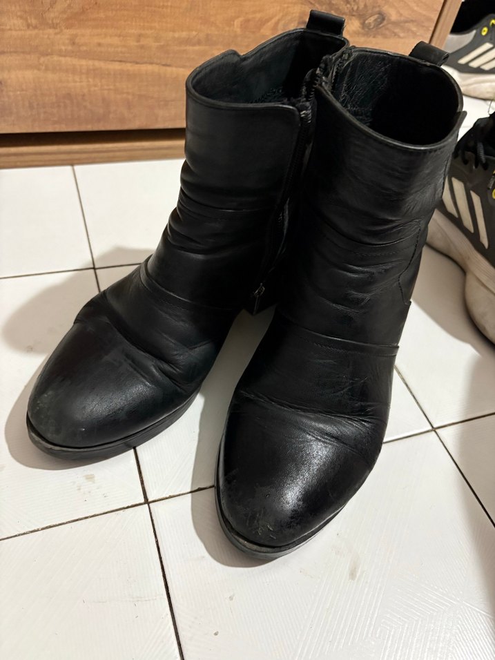 Siyah deri, tokalı ve kalın topuklu kadın botları, minimalist gotik tarzda, günlük kullanıma uygun.