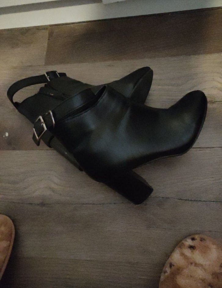 Siyah deri, tokalı, blok topuklu kadın botları. Trendy casual gotik stil için uygun. Günlük kullanıma rahat.37 numara