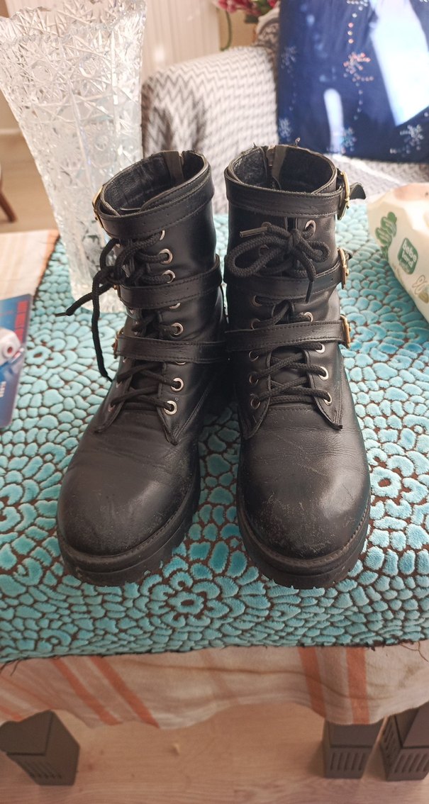 Siyah deri, tokalı ve topuklu kadın botları. Grunge punk goth tarzında, günlük kullanıma uygun, koyu renkli ve desensiz tasarım.