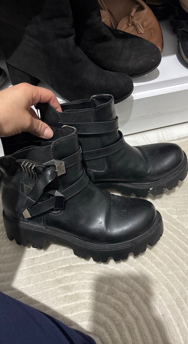 Siyah deri, tokalı ve kalın tabanlı kadın botu. Grunge punk tarzını yansıtan, günlük kullanıma uygun sağlam tasarım.