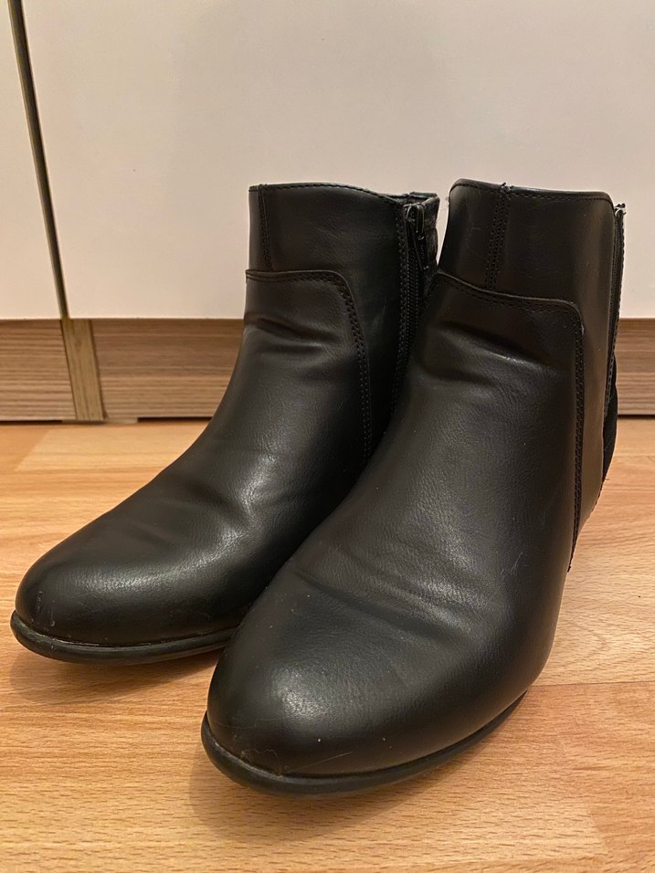 Siyah deri, tokalı, blok topuklu kadın botları. Minimalist ve gotik tarzda, günlük kullanım için uygun. Polaris