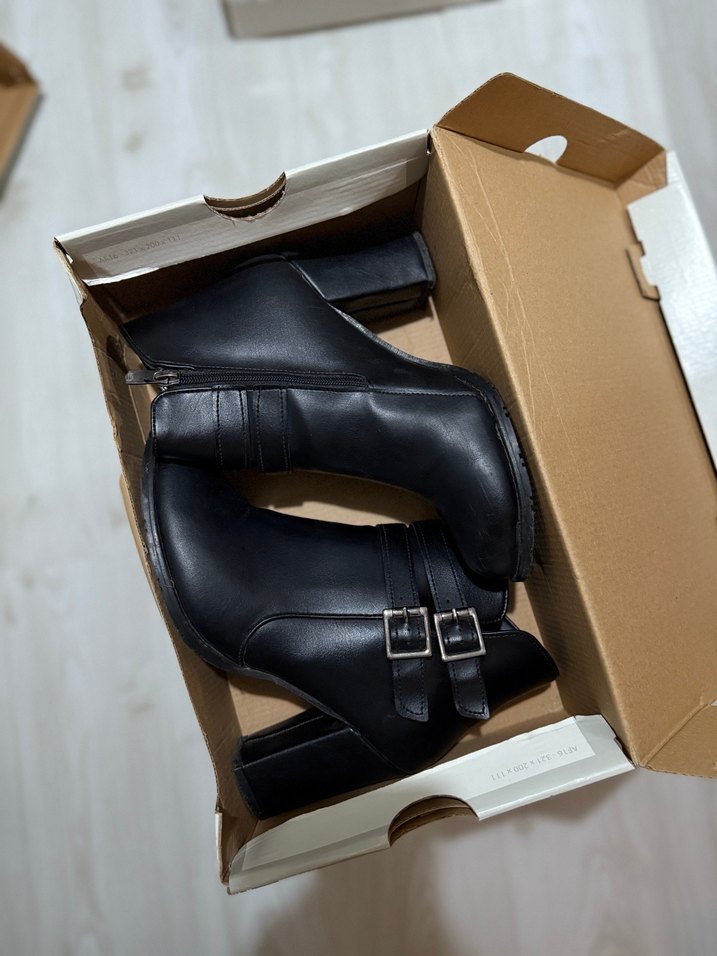 Siyah deri, çift tokalı, topuklu kadın bot. Minimalist tasarımıyla günlük sokak stiline uygun, rahat kullanımlık. sayılı kullanıldı yeni