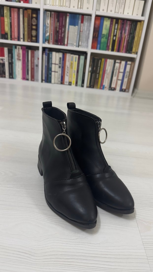 Siyah deri kadın botları, blok topuklu ve tokalı detaylı. Minimalist gotik tarzda, günlük kullanım için uygun.