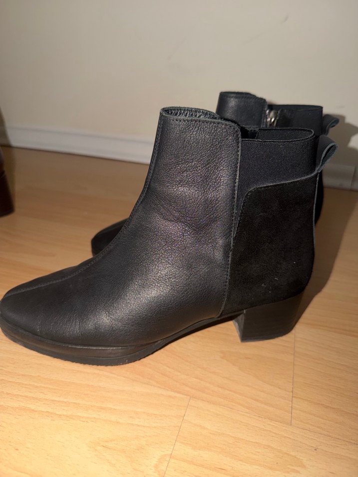 Siyah deri, tokalı, blok topuklu kadın botu. Günlük kullanıma uygun, minimalist ve gotik tarzda şık ve rahat. Defosu yoktur. Orijinal İnci