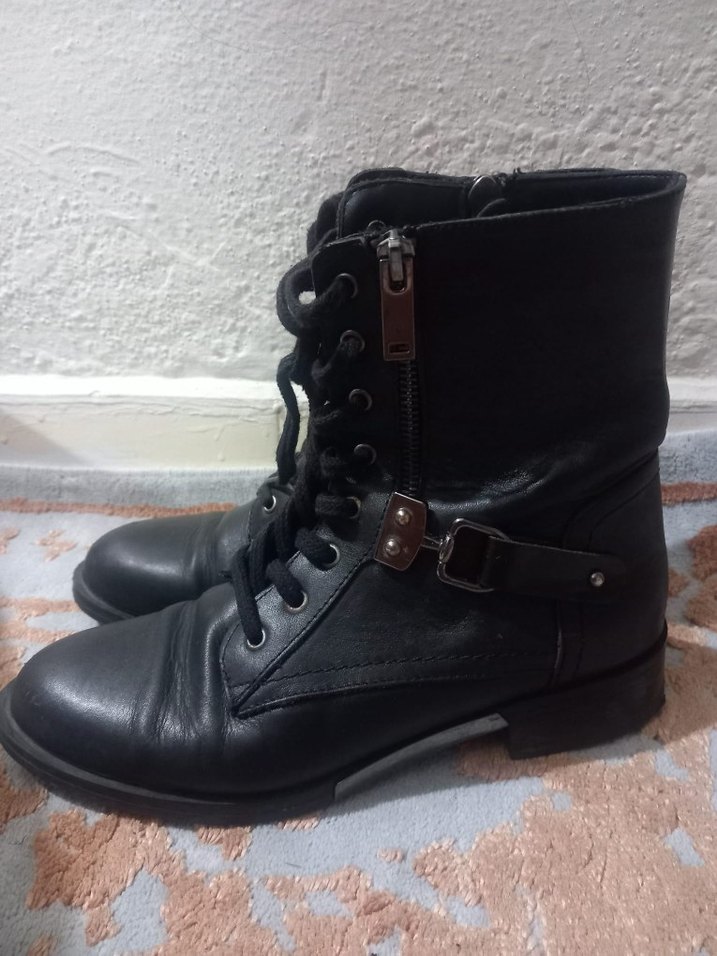 Siyah deri, tokalı ve blok topuklu kadın botu, günlük kullanıma uygun gotik tarzda tasarlanmıştır.