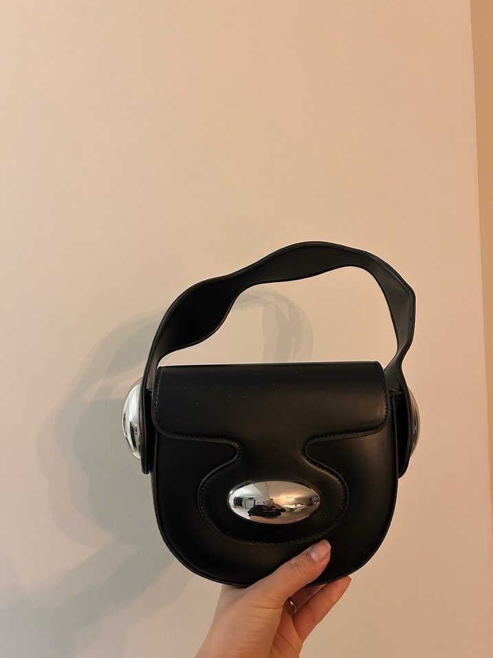 Siyah deri tokalı, minimal gotik tarzda kadın çanta. Baskılı desene sahip, moda öncüsü için günlük kullanıma uygun.