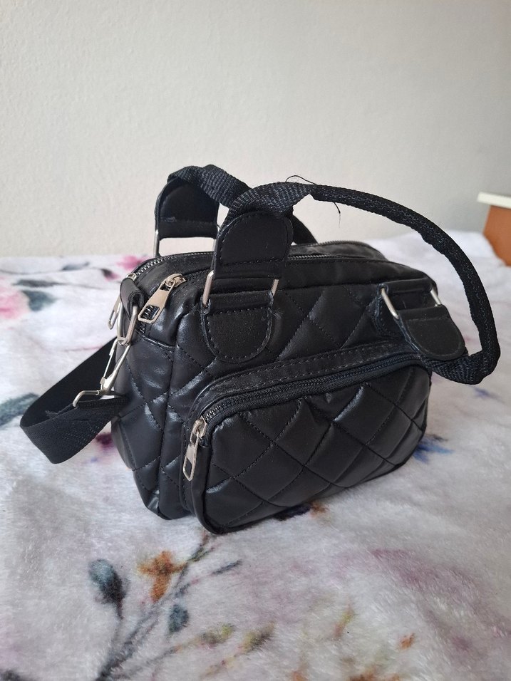 Tokalı detaylara sahip siyah deri kadın çantası, kapitone deseni ve çoklu fermuarlı bölmeler sunar. Sokak stili ve günlük kullanım için uygun.