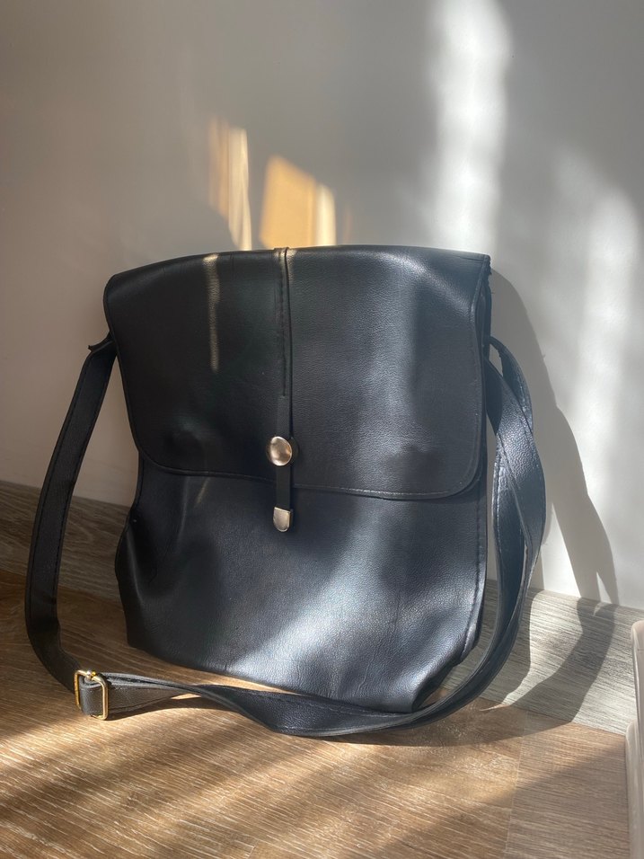 Siyah deri tokalı kadın çanta, minimalist gotik tarzda ve günlük kullanım için uygundur. Düz ve koyu renklidir.