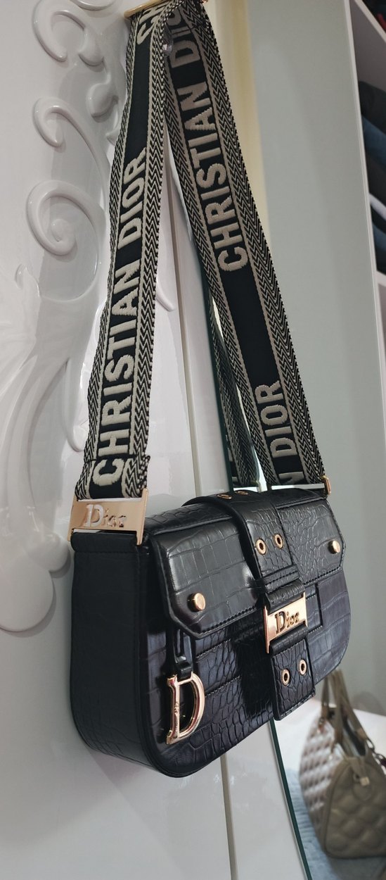 Siyah deri, tokalı kapaklı ve geniş Christian Dior baskılı (diğer) askıya sahip kadın çanta, günlük kullanıma uygun.
