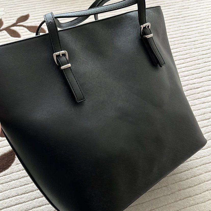 Siyah deri, tokalı askılı, parlak yüzeyli, düz ve desen içermeyen, günlük kullanım ve iş ortamına uygun çağdaş tarzda kadın çantası.