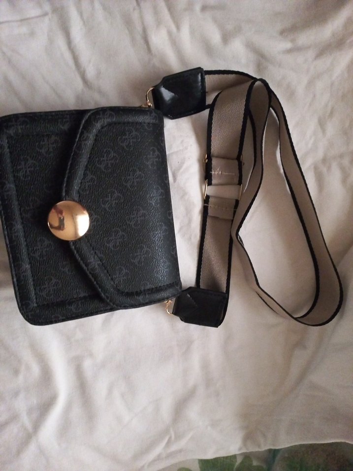 Tokalı kapama ve ayarlanabilir askıya sahip siyah deri kadın çantası.