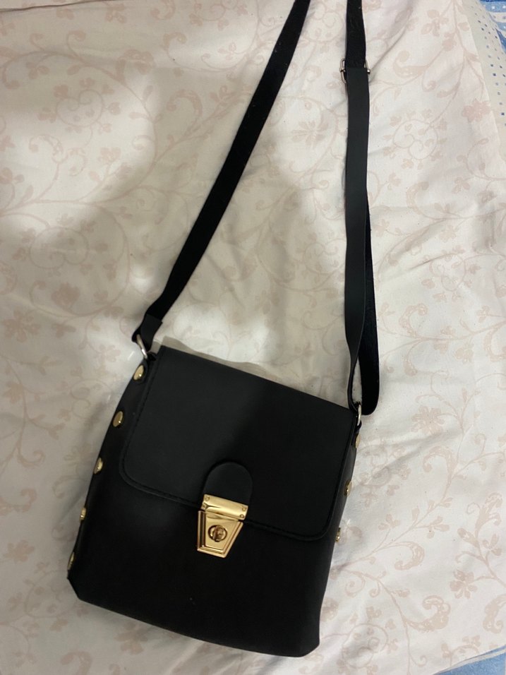 Siyah deri tokalı çanta, minimalist ve gotik tarzda. Günlük kullanıma uygun, cesur bir görünüm sunar.