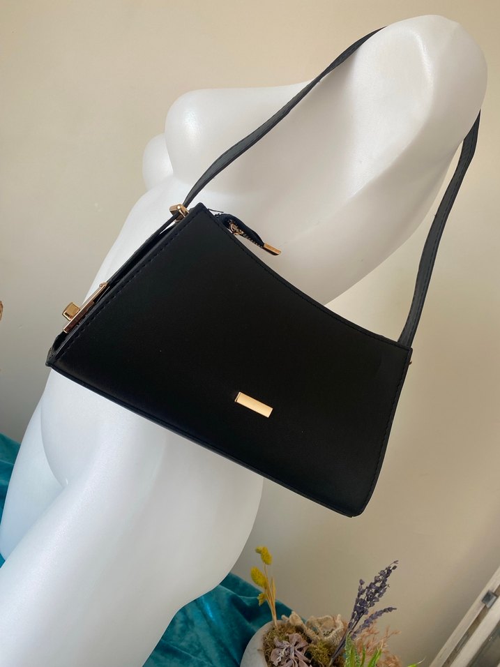 Siyah deri, tokalı ve desensiz tasarıma sahip kadın çantası, günlük kullanım için minimalist sokak stiline uygun.