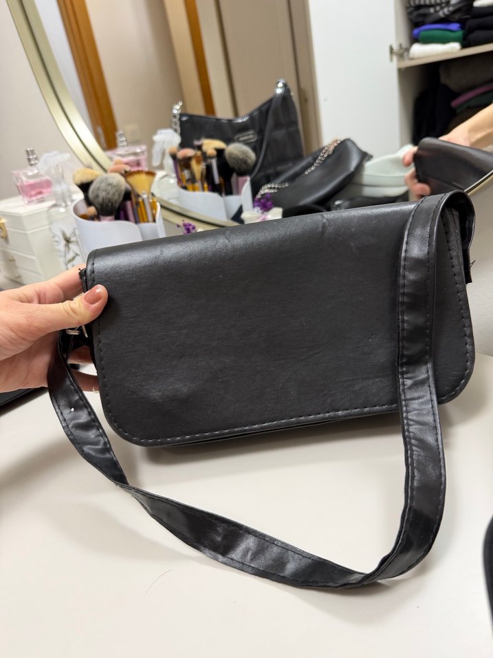 Gündelik kullanım için siyah deri, tokalı kadın çantası. Düz ve gotik tarzıyla sade bir görünüme sahiptir.
