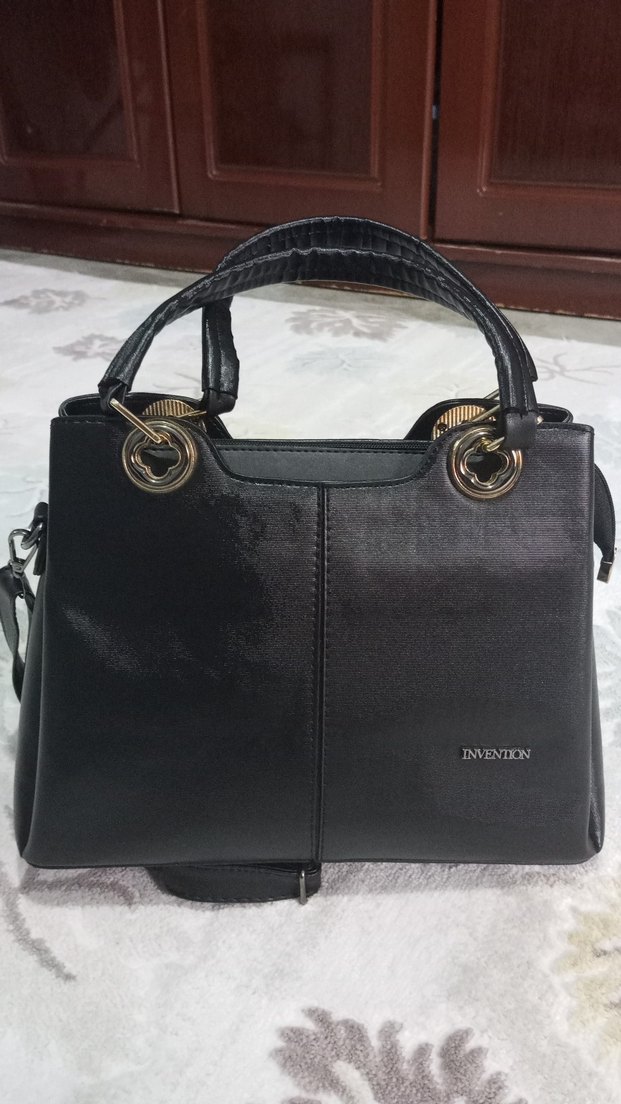 Tokalı saplarıyla siyah deri kadın çanta, modern klasik tarzda ve "INVENTION" yazısı ile. Günlük kullanım için Paris havası taşıyor.