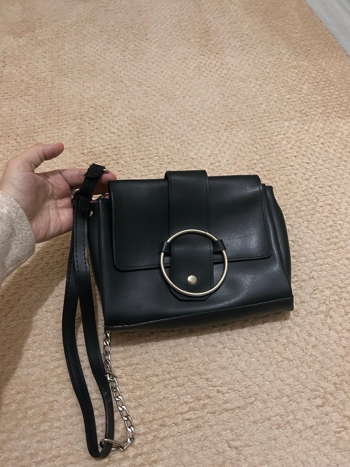 Siyah deri, tokalı kapak ve zincir detaylı askıya sahip kadın çantası. Minimalist, desen içermeyen tasarımıyla günlük sokak stiline uygun.