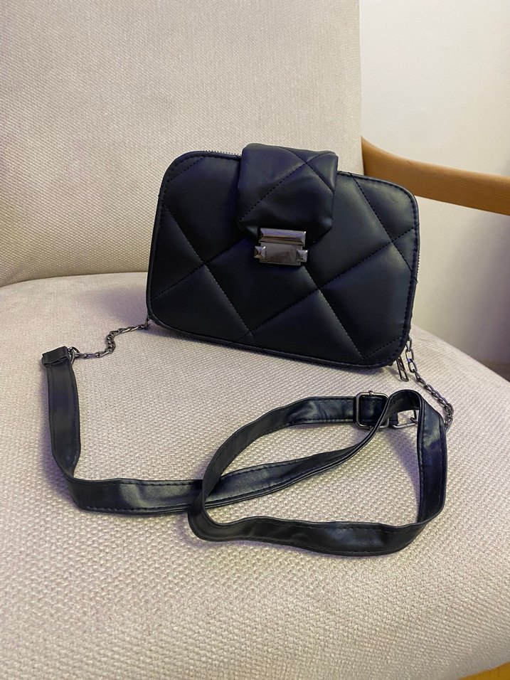 Siyah deri tokalı kadın çantası, zincir askılı ve çağdaş klasik Paris tarzında günlük kullanıma uygundur.