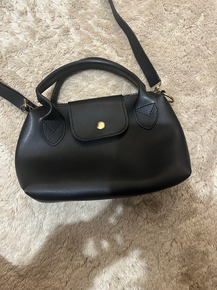 Modern klasik tarzda, tokalı kapaklı siyah deri kadın çanta. Uzun askısı mevcut