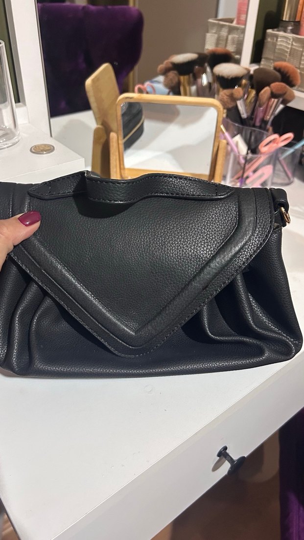 Siyah deri, tokalı kapağı ve desen içermeyen şık tasarımıyla günlük kullanıma uygun, çağdaş Paris tarzı kadın çantası.