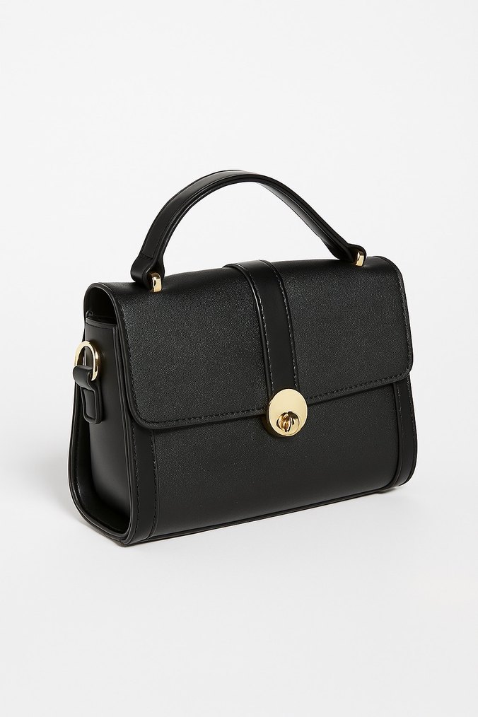 Siyah deri tokalı kapama detayına sahip, modern klasik tasarımlı kadın çantası. Ofis kullanımı için uygun, yapılı kulplu ve desensiz yüzeyi bulunur.