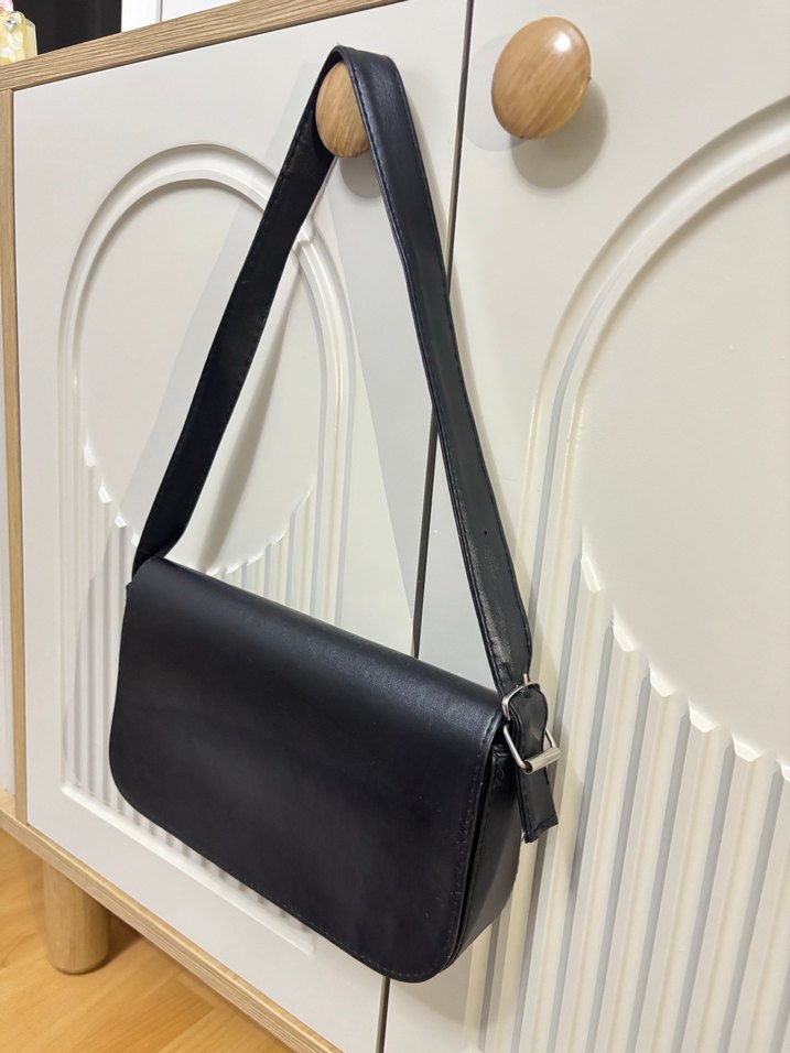 Siyah deri tokalı askıya sahip, desen içermeyen minimal tasarımlı kadın çantası. Günlük kullanıma uygun çağdaş ve klasik şıklıkta. Üstündeki ıslak mendil izi bi kusuru yoktur