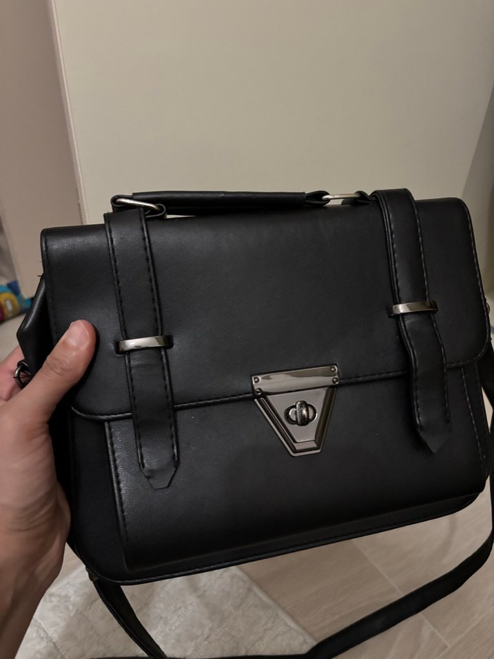 Siyah deri, tokalı kayışlara sahip, desen içermeyen, günlük iş kullanımı için uygun sade kadın çantası.