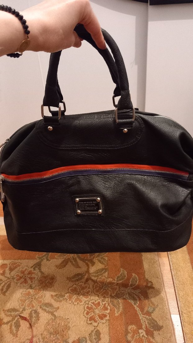 Tokalı saplara sahip siyah deri kadın çantası, baskılı deseni ve önde fermuarlı cepleri bulunur. Günlük kullanım için uygundur. az kullanıldı sorunsuz