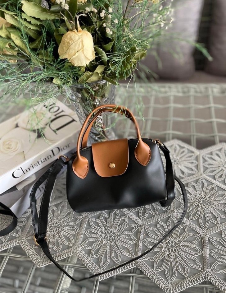 Siyah deri ve kahverengi detaylara sahip tokalı kadın çanta, günlük kullanıma uygun şık ve modern tasarım. markası belirsz
