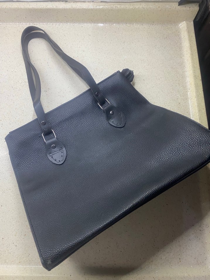Tokalı askıları ve desen içermeyen düz yüzeyiyle siyah deri kadın çantası, iş ve günlük kullanım için uygundur.