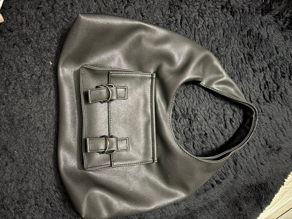 Siyah deri kadın çanta, tokalı ön cepleri ve desen içermeyen yüzeyiyle gotik ve sokak stiline uygun.