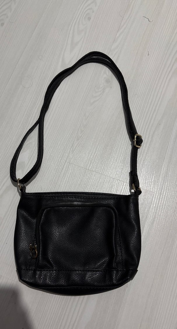 Siyah deri, tokalı askılı kadın çantası. Minimalist ve desen içermeyen tasarımıyla günlük sokak stiline uygundur.