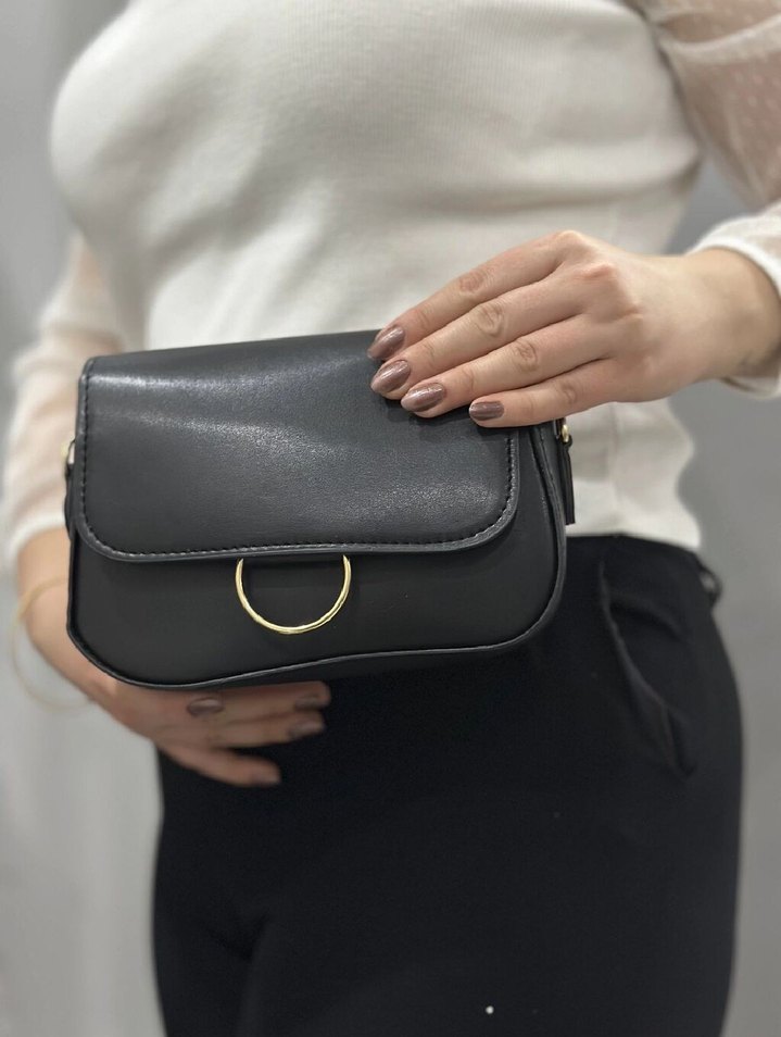 Siyah deriden, tokalı kapaklı, desen içermeyen kadın çanta, günlük sokak stili için uygun ve minimalist tasarıma sahip.