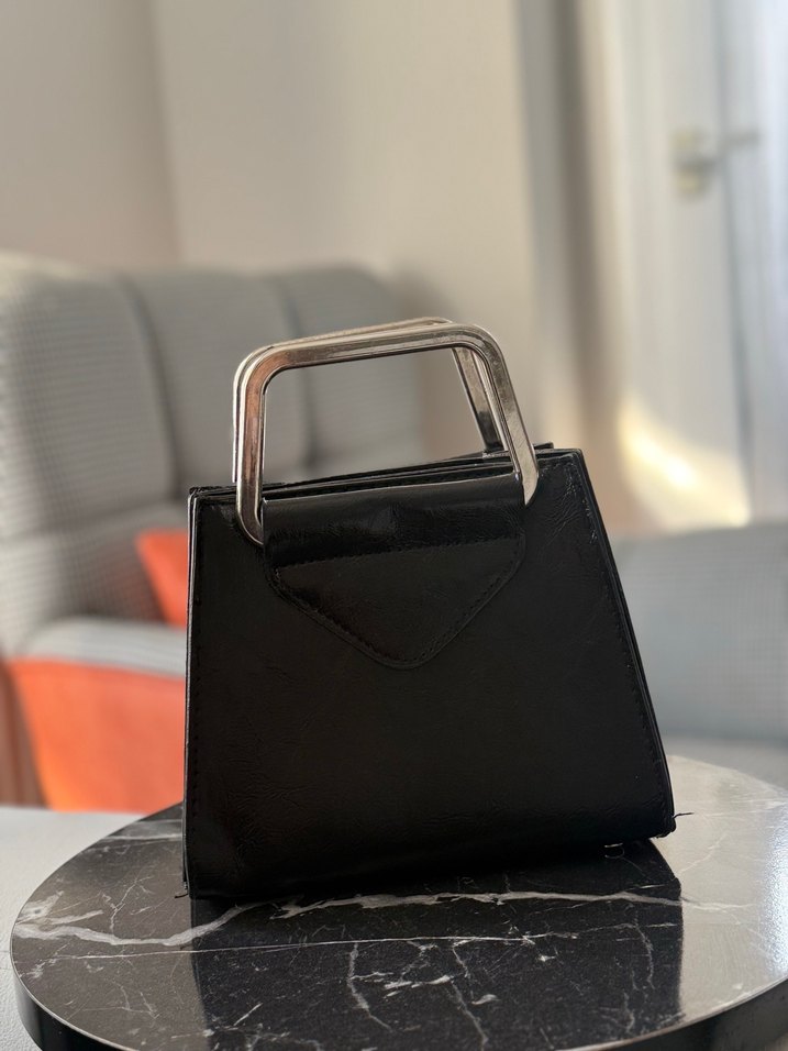 Siyah deri tokalı metal saplı kadın çanta, minimalist baskılı tasarıma sahip. Günlük kullanıma uygun çağdaş stil.