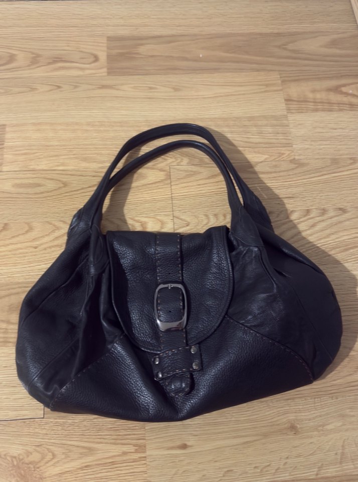 Italyan marka siyah deri, tokalı kapaklı kadın çantası. Minimalist gotik tarzda, günlük kullanıma uygun, düz yüzeyli ve çift saplı.