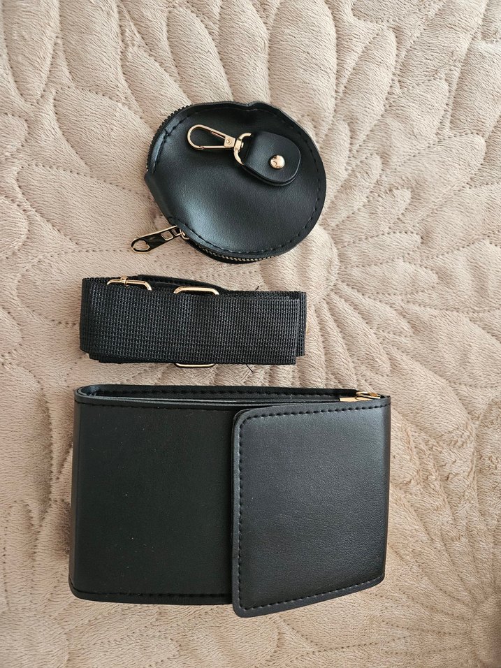 Siyah deri, tokalı kadın çanta seti; ana çanta, çıkarılabilir askı ve küçük yuvarlak kanca detaylı cüzdan içerir. Minimalist sokak stili.