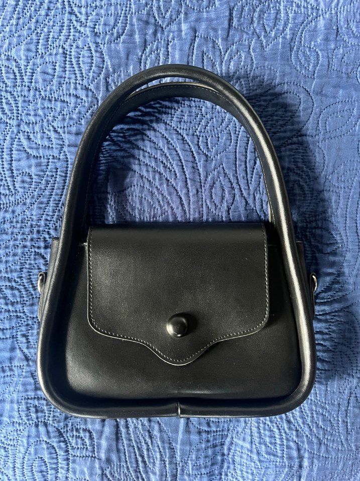 Siyah deri, tokalı kapaklı kadın çantası. Düz ve desen içermeyen tasarımıyla günlük kullanıma uygun, gotik ve avangart tarzda.