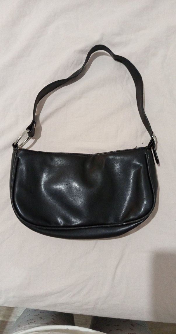 Tokalı askıya sahip siyah deri kadın çantası, minimalist ve gotik tarzda. Düz ve desensiz yapısıyla günlük kullanım için uygundur.