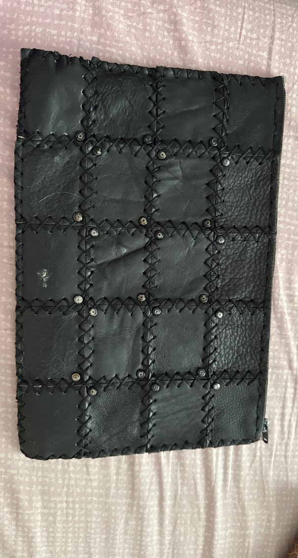 Tokalı detaylara ve dikişli patchwork tasarıma sahip siyah deri clutch çanta, gotik ve grunge punk tarzına uygun günlük kullanım için.