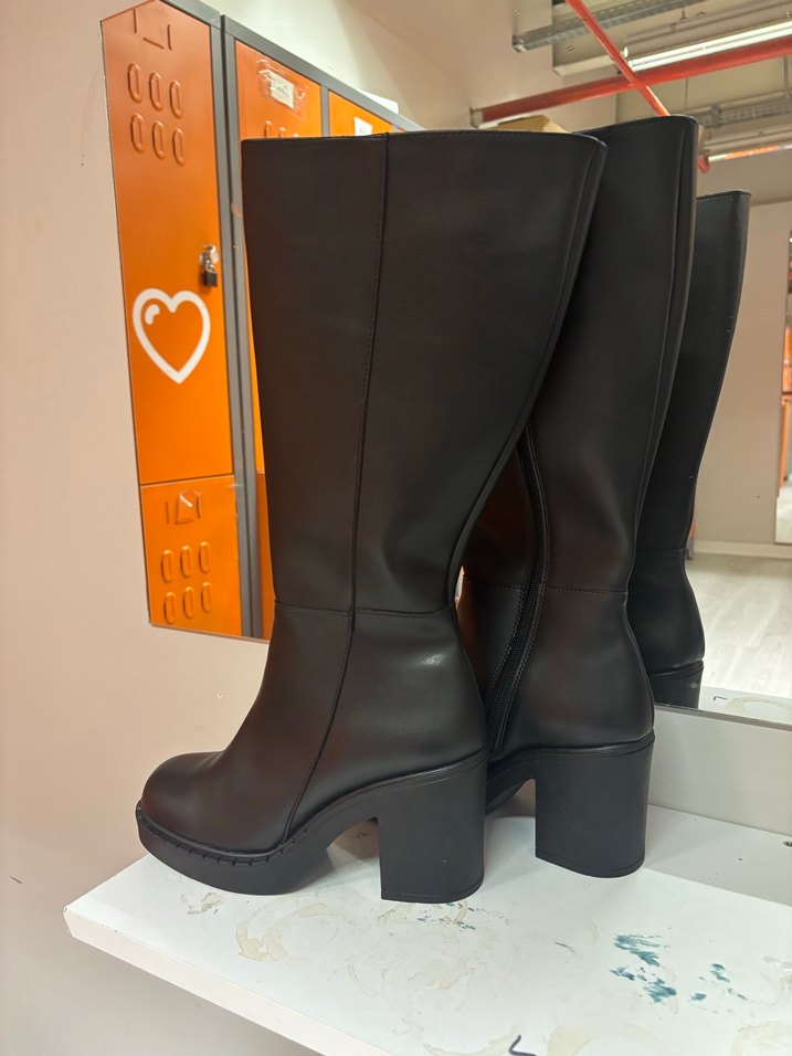 Siyah deri, tokalı, blok topuklu dizüstü botlar. Cesur ve çağdaş sokak stili için uygun, günlük kullanıma ideal.