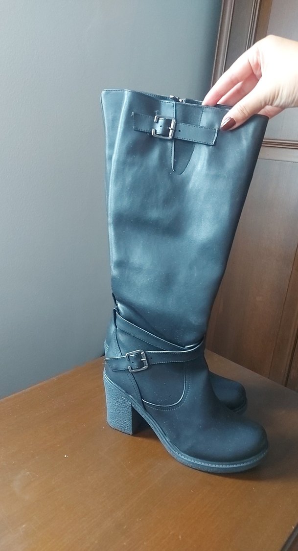 Siyah deri dizüstü çizme, tokalı kayışları ve kalın topukları ile trend sokak ve gotik tarzını yansıtıyor. Günlük kullanıma uygun.