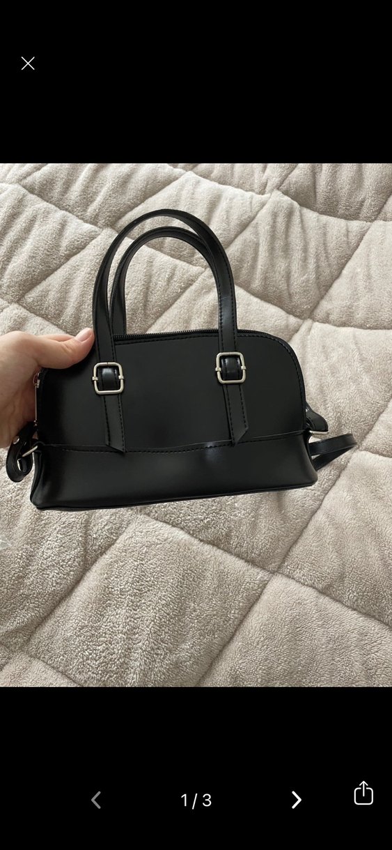 Siyah deri, tokalı detaylara sahip, iki saplı sade kadın el çantasıdır. Günlük kullanıma uygun goth tarzında.
